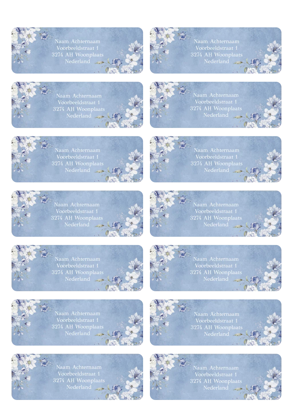 Adresstickers met bloem blauw. Plaats eenvoudig zelf alle adressen op de adresstickers. • 14 adresstickers per vel • formaat van 97x34 mm • ronde hoeken Maak het geboortekaartje helemaal af door de envelop dicht te plakken met een bijpassende sluitzegel!