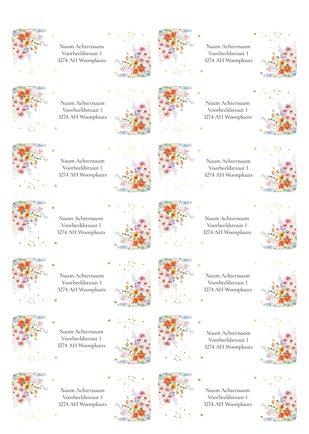 Adresstickers huwelijk met bloemen en goudfolie. Plaats eenvoudig zelf alle adressen op de adresstickers. • 14 adresstickers per vel • formaat van 97x34 mm • ronde hoeken Maak het geboortekaartje helemaal af door de envelop dicht te plakken met een bijpassende sluitzegel!