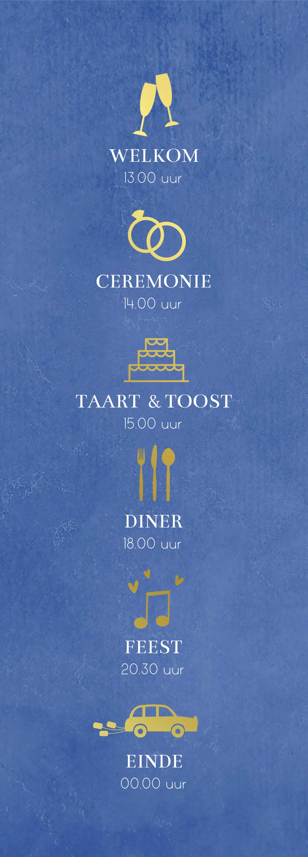 150 x 54 mm (per 3 stuks). Maak jullie trouwkaart compleet met dit elegante smalle dagprogramma kaartje! Je kunt de strip los bij de trouwkaart in de envelop stoppen of aan de trouwkaart bevestigen met een mooie paperclip.