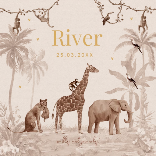 Een mooie canvasposter voor aan de muur in de babykamer met safari dieren en houtlook achtergrond. Pas de poster naar wens aan in onze online editor. Bij de poster worden magnetische houten latjes geleverd.