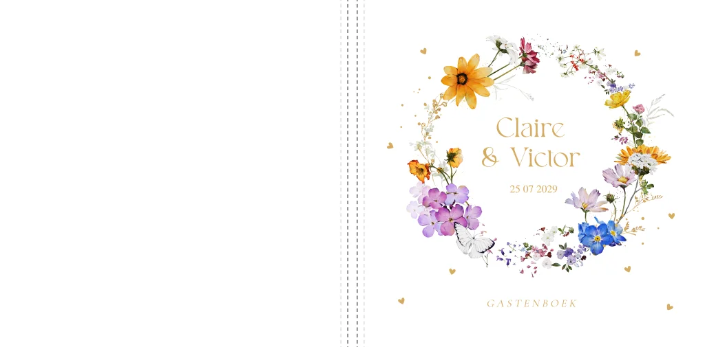 Een gastenboek in stijl van jullie trouwkaart! Dit gastenboek met bloemenkrans heeft een mooie luxe uitstraling. Goed om te weten: • Inhoud: 36 bladen, 72 blanco pagina’s. • De omslag is een glanzende harde kaft. • De voor- en achterkant kun je helemaal personaliseren naar eigen wens. • Foliedruk niet mogelijk.