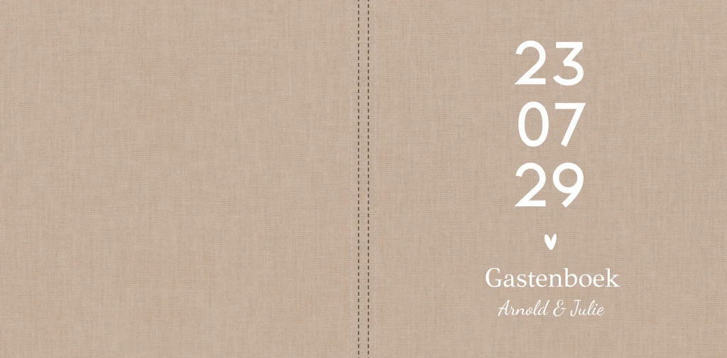 Een gastenboek in stijl van jullie trouwkaart! Dit gastenboek met linnenlook (geen echte linnen) beige heeft een mooie luxe uitstraling. Goed om te weten: • Inhoud: 36 bladen, 72 blanco pagina’s. • De omslag is een glanzende harde kaft. • De voor- en achterkant kun je helemaal personaliseren naar eigen wens. • Foliedruk niet mogelijk.