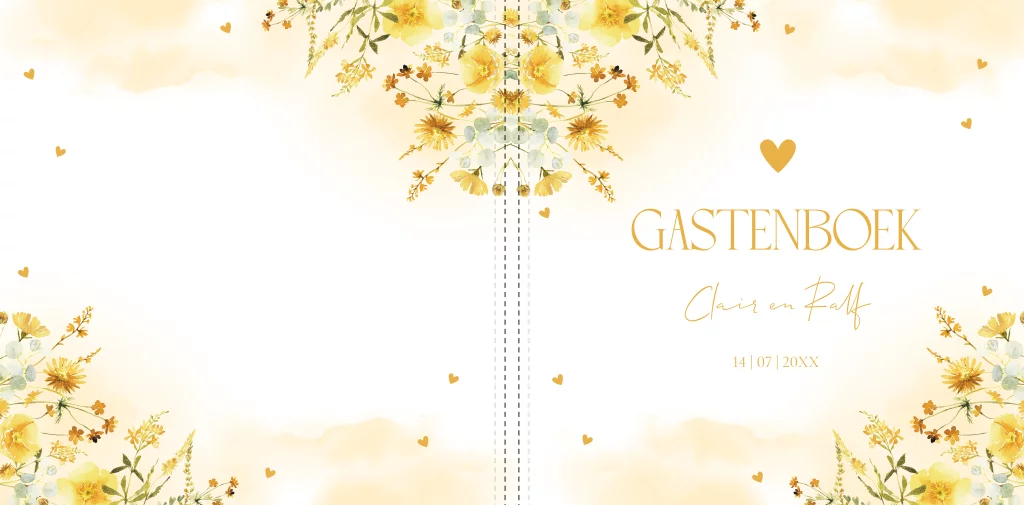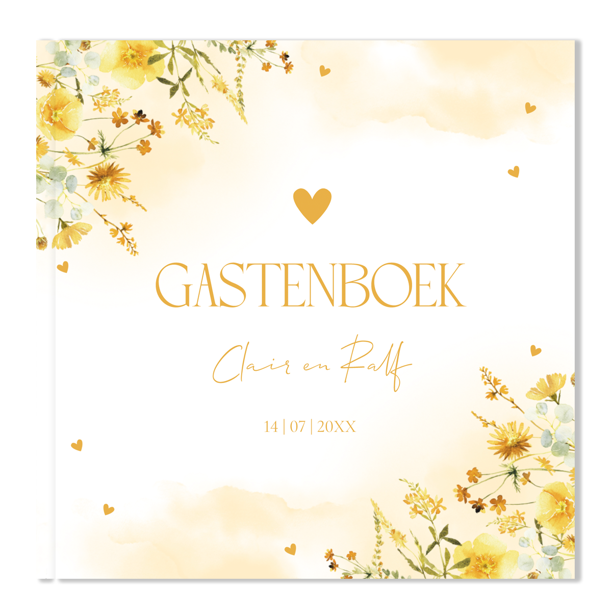 Een gastenboek in stijl van jullie trouwkaart! Dit gastenboek met gele bloemen heeft een mooie luxe uitstraling. Goed om te weten: • Inhoud: 36 bladen, 72 blanco pagina’s. • De omslag is een glanzende harde kaft. • De voor- en achterkant kun je helemaal personaliseren naar eigen wens. • Foliedruk niet mogelijk.