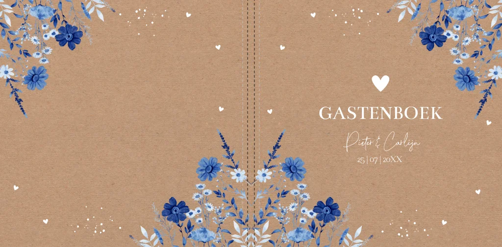Een gastenboek in stijl van jullie trouwkaart! Dit gastenboek met blauwe watercolour bloemen en kraftlook heeft een mooie luxe uitstraling. Goed om te weten: • Inhoud: 36 bladen, 72 blanco pagina’s. • De omslag is een glanzende harde kaft. • De voor- en achterkant kun je helemaal personaliseren naar eigen wens. • Foliedruk niet mogelijk.