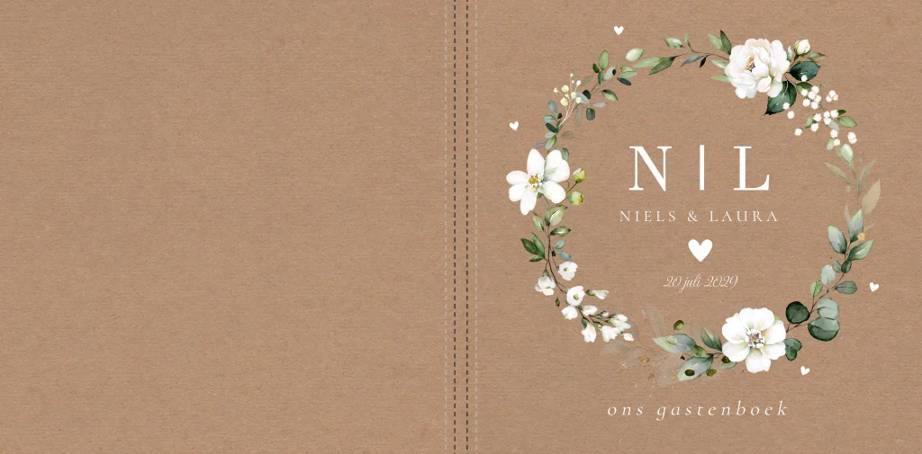 Een gastenboek in stijl van jullie trouwkaart! Dit gastenboek blauw met bloemenkrans en kraftlook heeft een mooie luxe uitstraling. Goed om te weten: • Inhoud: 36 bladen, 72 blanco pagina’s. • De omslag is een glanzende harde kaft. • De voor- en achterkant kun je helemaal personaliseren naar eigen wens. • Foliedruk niet mogelijk.