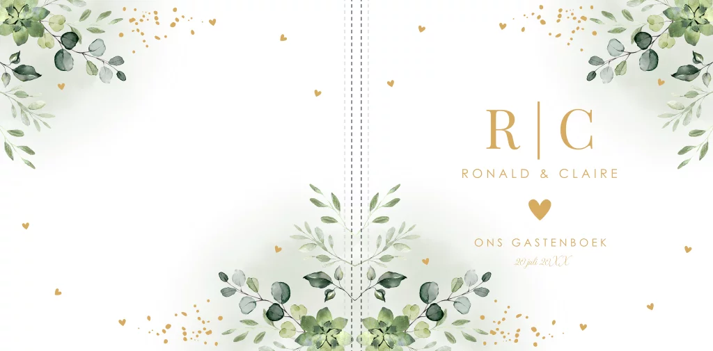 Een gastenboek in stijl van jullie trouwkaart! Dit gastenboek met botanische bladeren heeft een mooie luxe uitstraling. Goed om te weten: • Inhoud: 36 bladen, 72 blanco pagina’s. • De omslag is een glanzende harde kaft. • De voor- en achterkant kun je helemaal personaliseren naar eigen wens. • Foliedruk niet mogelijk.