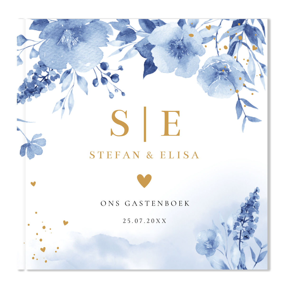 Een gastenboek in stijl van jullie trouwkaart! Dit gastenboek met watercolour bloemen blauw heeft een mooie luxe uitstraling. Goed om te weten: • Inhoud: 36 bladen, 72 blanco pagina’s. • De omslag is een glanzende harde kaft. • De voor- en achterkant kun je helemaal personaliseren naar eigen wens. • Foliedruk niet mogelijk.
