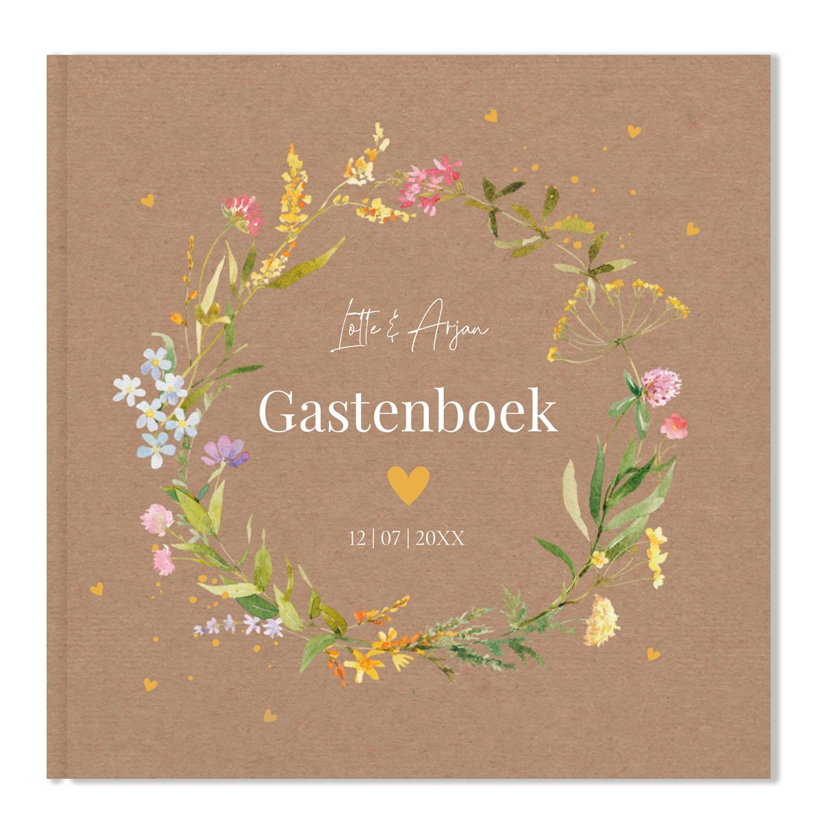 Gastenboek bruiloft kraftlook bloemenkrans geel