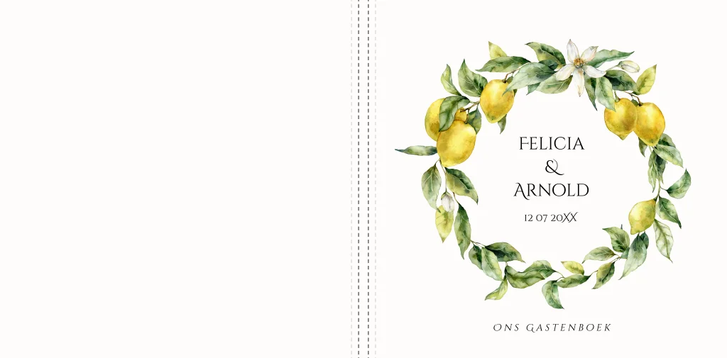 Een gastenboek in stijl van jullie trouwkaart! Dit gastenboek met mediterraanse citroenen geel heeft een mooie luxe uitstraling. Goed om te weten: • Inhoud: 36 bladen, 72 blanco pagina’s. • De omslag is een glanzende harde kaft. • De voor- en achterkant kun je helemaal personaliseren naar eigen wens. • Foliedruk niet mogelijk.