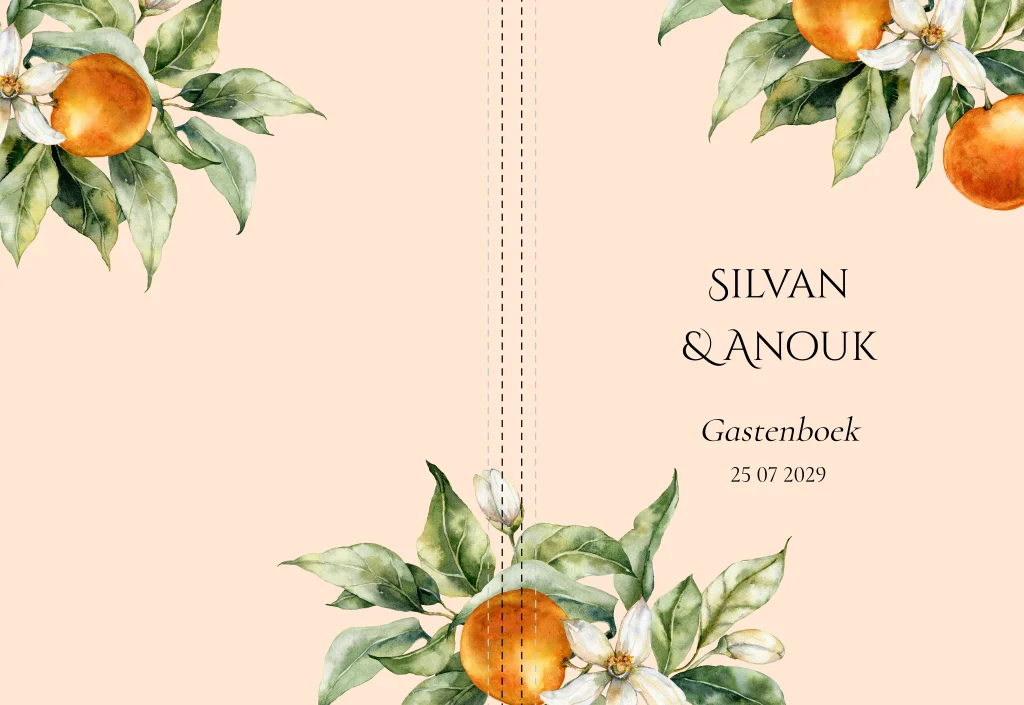 Een gastenboek in stijl van jullie trouwkaart! Dit gastenboek peach oranje met mooie typografie heeft een mooie luxe uitstraling. Goed om te weten: • Inhoud: 36 bladen, 72 blanco pagina’s. • De omslag is een glanzende harde kaft. • De voor- en achterkant kun je helemaal personaliseren naar eigen wens. • Foliedruk niet mogelijk.