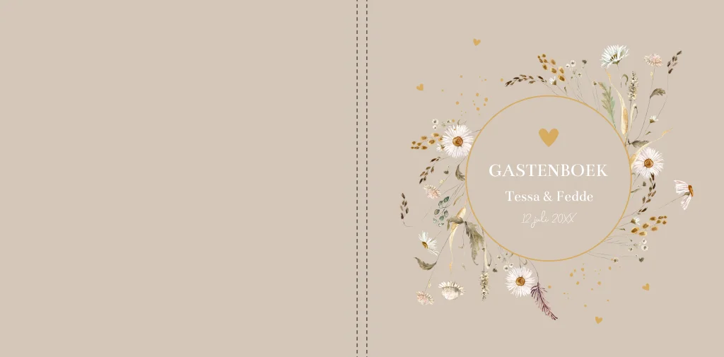 Een gastenboek in stijl van jullie trouwkaart! Dit gastenboek met beige bloemen heeft een mooie luxe uitstraling. Goed om te weten: • Inhoud: 36 bladen, 72 blanco pagina’s. • De omslag is een glanzende harde kaft. • De voor- en achterkant kun je helemaal personaliseren naar eigen wens. • Foliedruk niet mogelijk.
