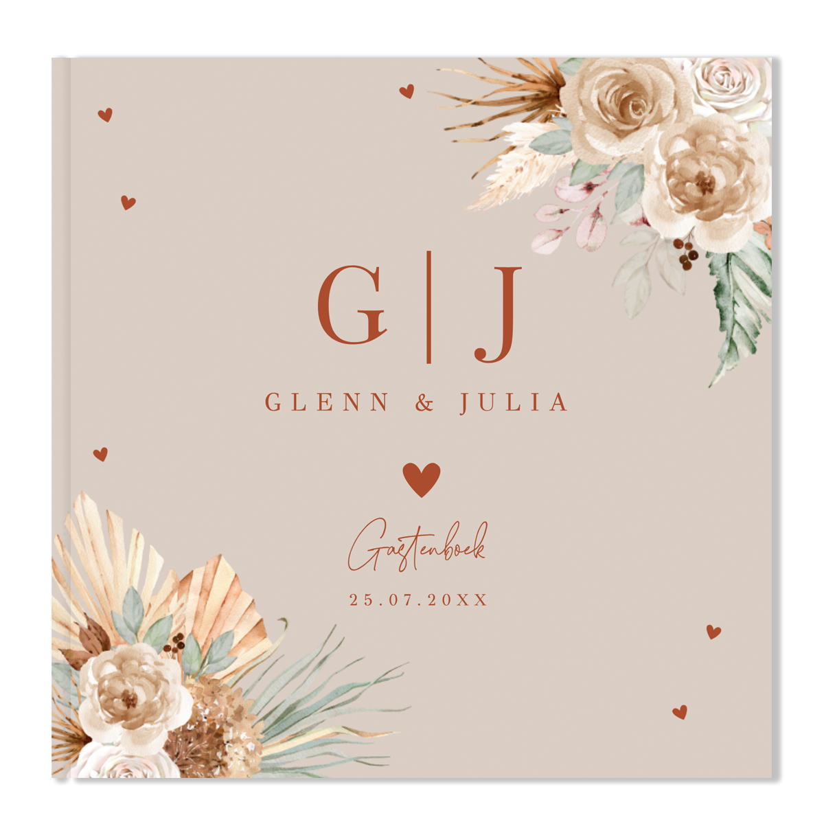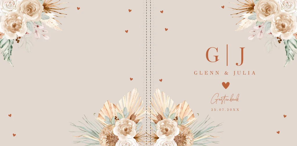 Een gastenboek in stijl van jullie trouwkaart! Dit gastenboek beige met bohemian bloemen heeft een mooie luxe uitstraling. Goed om te weten: • Inhoud: 36 bladen, 72 blanco pagina’s. • De omslag is een glanzende harde kaft. • De voor- en achterkant kun je helemaal personaliseren naar eigen wens. • Foliedruk niet mogelijk.