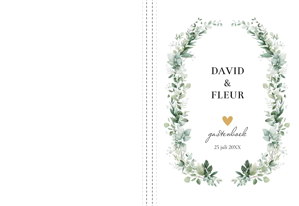 Een gastenboek in stijl van jullie trouwkaart! Dit gastenboek wit met botanische groene watercolour bladeren heeft een mooie luxe uitstraling. Goed om te weten: • Inhoud: 36 bladen, 72 blanco pagina’s. • De omslag is een glanzende harde kaft. • De voor- en achterkant kun je helemaal personaliseren naar eigen wens. • Foliedruk niet mogelijk.