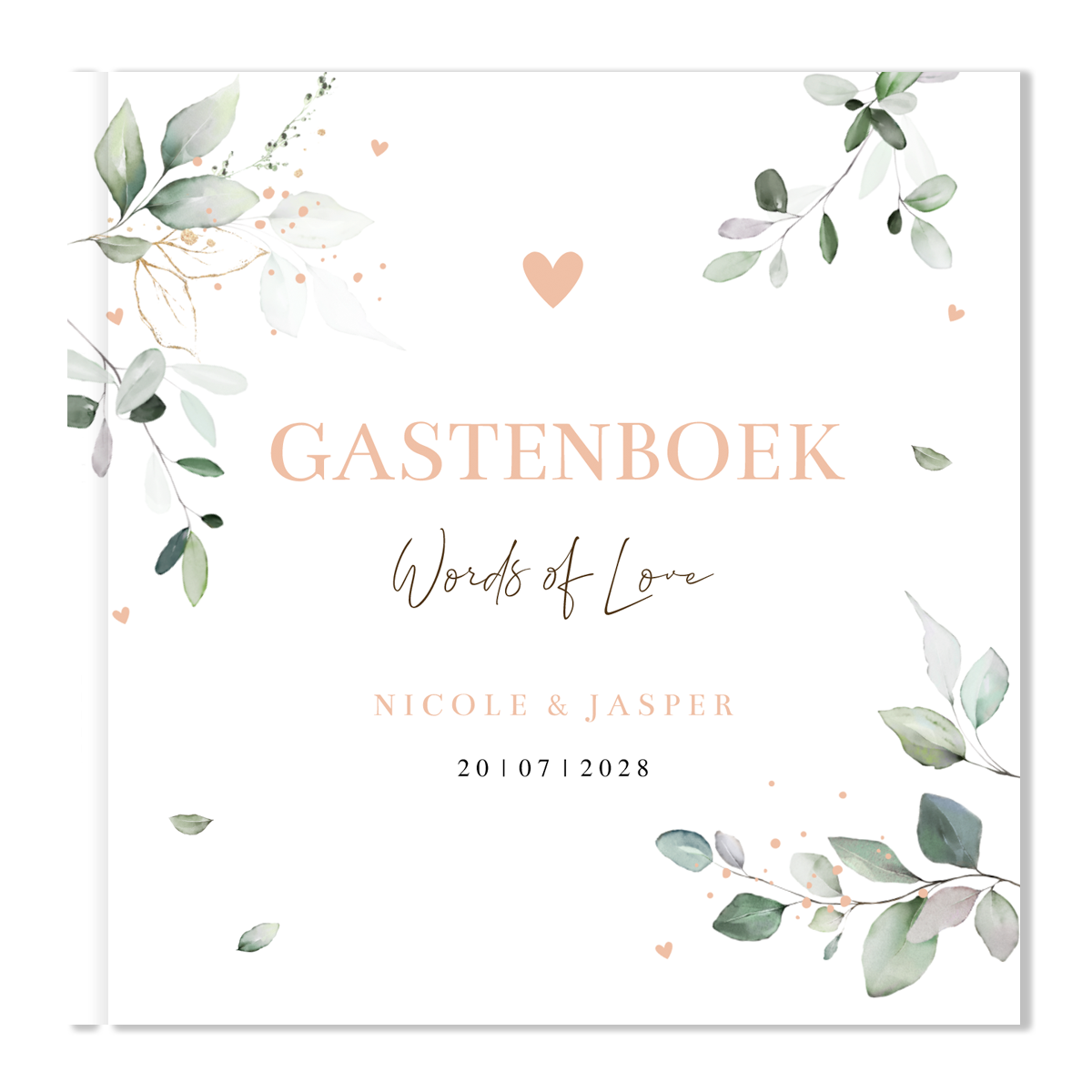 Een gastenboek in stijl van jullie trouwkaart! Dit gastenboek met botanische bladeren heeft een mooie luxe uitstraling. Goed om te weten: • Inhoud: 36 bladen, 72 blanco pagina’s. • De omslag is een glanzende harde kaft. • De voor- en achterkant kun je helemaal personaliseren naar eigen wens. • Foliedruk niet mogelijk.