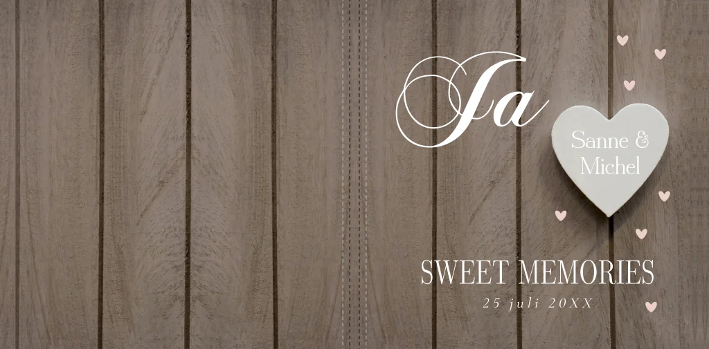 Een gastenboek in stijl van jullie trouwkaart! Dit gastenboek bruin met houtlook en hartjes heeft een mooie luxe uitstraling. Goed om te weten: • Inhoud: 36 bladen, 72 blanco pagina’s. • De omslag is een glanzende harde kaft. • De voor- en achterkant kun je helemaal personaliseren naar eigen wens. • Foliedruk niet mogelijk.