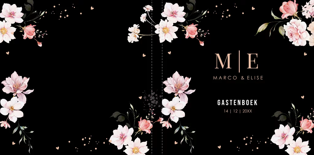 Gastenboek huwelijk zwart met roze bloemen