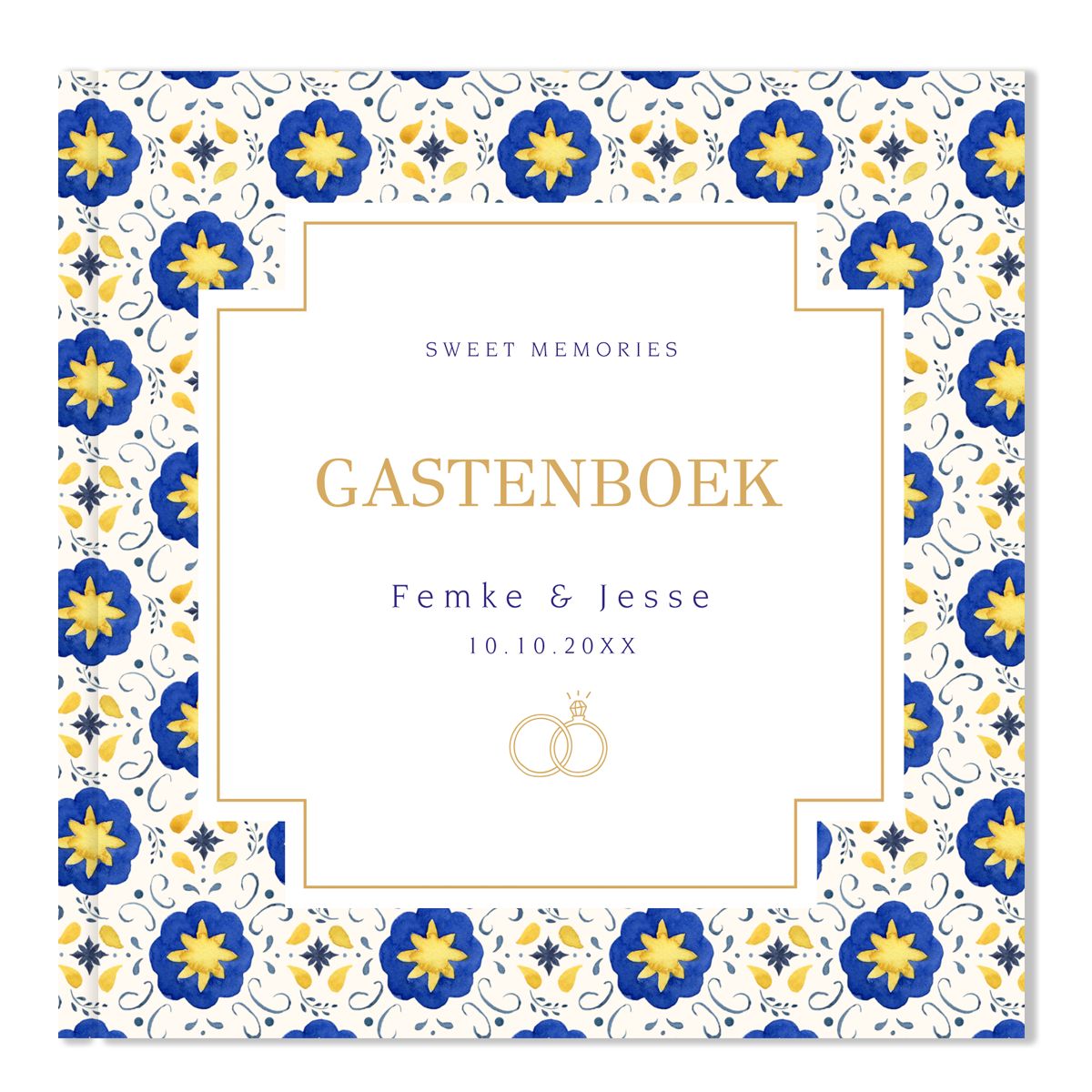 Een gastenboek in stijl van jullie trouwkaart! Dit gastenboek met mediterraans patroon blauw geel heeft een mooie luxe uitstraling. Goed om te weten: • Inhoud: 36 bladen, 72 blanco pagina’s. • De omslag is een glanzende harde kaft. • De voor- en achterkant kun je helemaal personaliseren naar eigen wens. • Foliedruk niet mogelijk.