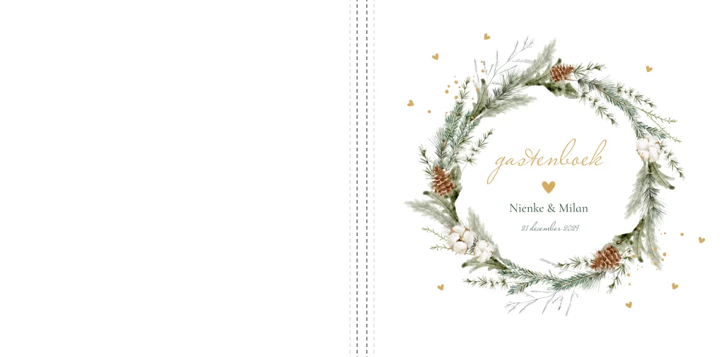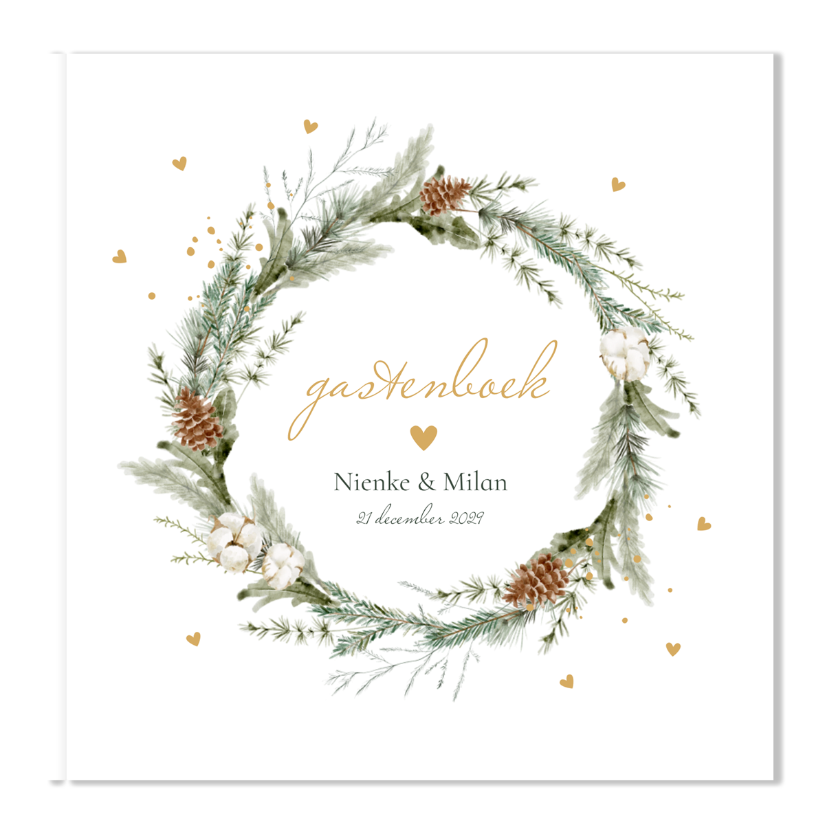 Een gastenboek in stijl van jullie trouwkaart! Dit gastenboek met kerstkrans heeft een mooie luxe uitstraling. Goed om te weten: • Inhoud: 36 bladen, 72 blanco pagina’s. • De omslag is een glanzende harde kaft. • De voor- en achterkant kun je helemaal personaliseren naar eigen wens. • Foliedruk niet mogelijk.