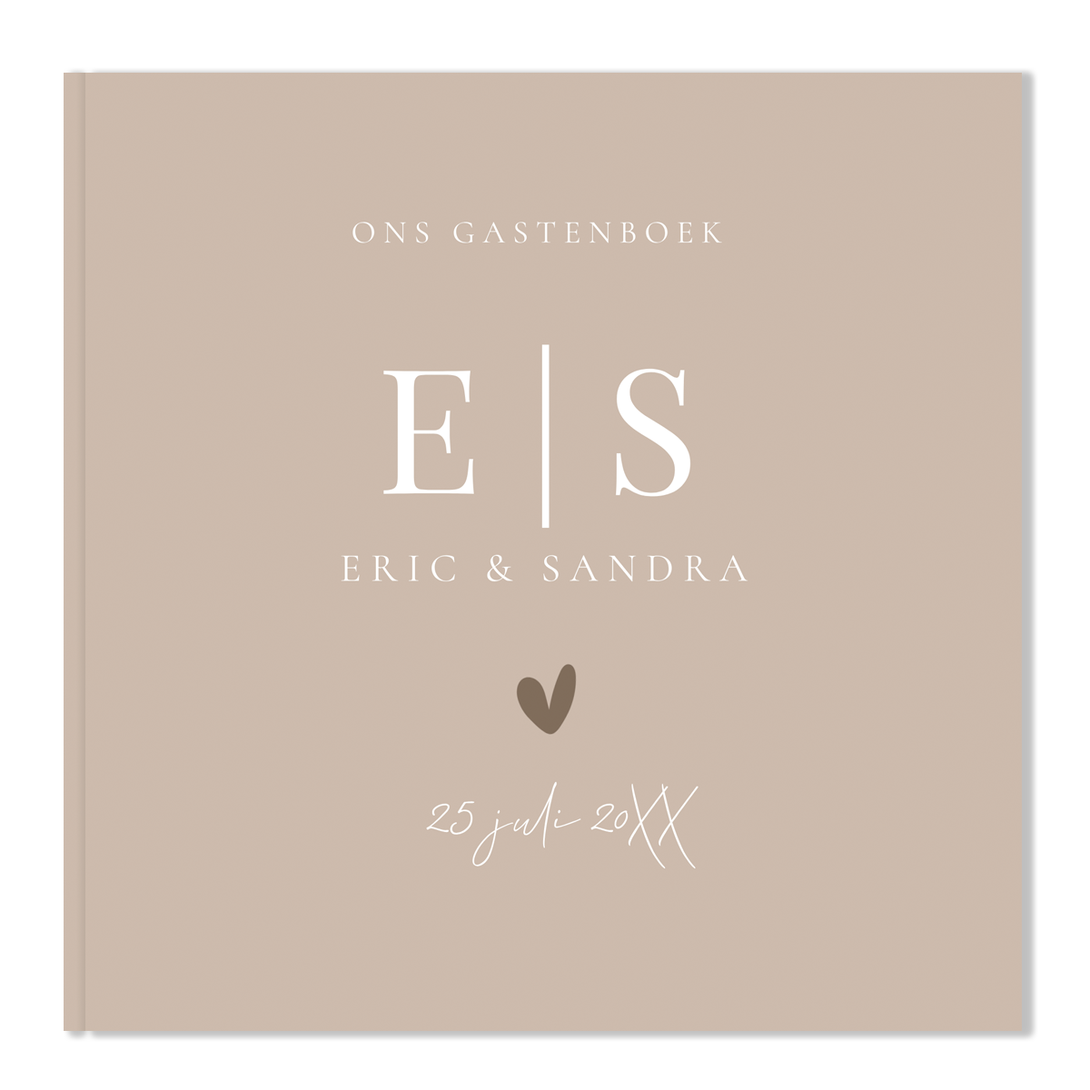Een gastenboek in stijl van jullie trouwkaart! Dit gastenboek zandkleurig heeft een mooie luxe uitstraling. Goed om te weten: • Inhoud: 36 bladen, 72 blanco pagina’s. • De omslag is een glanzende harde kaft. • De voor- en achterkant kun je helemaal personaliseren naar eigen wens. • Foliedruk niet mogelijk.