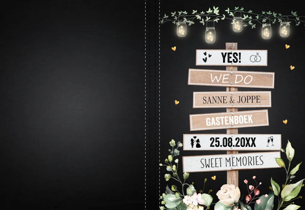 Een gastenboek in stijl van jullie trouwkaart! Dit gastenboek met houten wegwijzer, lampjes en groene bladeren heeft een mooie luxe uitstraling. Goed om te weten: • Inhoud: 36 bladen, 72 blanco pagina’s. • De omslag is een glanzende harde kaft. • De voor- en achterkant kun je helemaal personaliseren naar eigen wens. • Foliedruk niet mogelijk.
