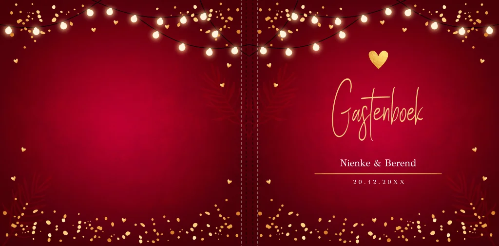 Een gastenboek in stijl van jullie trouwkaart! Dit gastenboek rood met sfeervolle lampjes en goudlook heeft een mooie luxe uitstraling. Goed om te weten: • Inhoud: 36 bladen, 72 blanco pagina’s. • De omslag is een glanzende harde kaft. • De voor- en achterkant kun je helemaal personaliseren naar eigen wens. • Foliedruk niet mogelijk.
