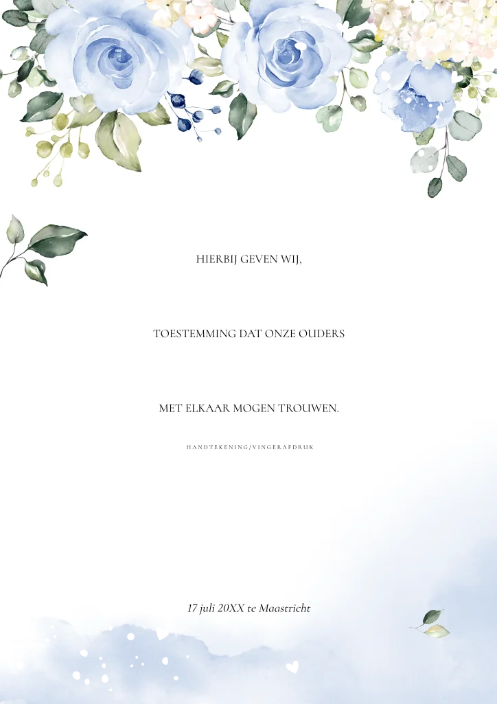 Kinderakte helemaal in stijl van jullie trouwkaart met waterverf bloemen blauw en goudfolie.
