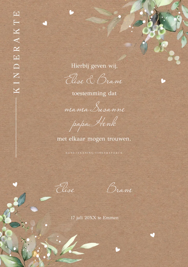 Kinderakte huwelijk met groene bladeren helemaal in stijl van jullie trouwkaart.