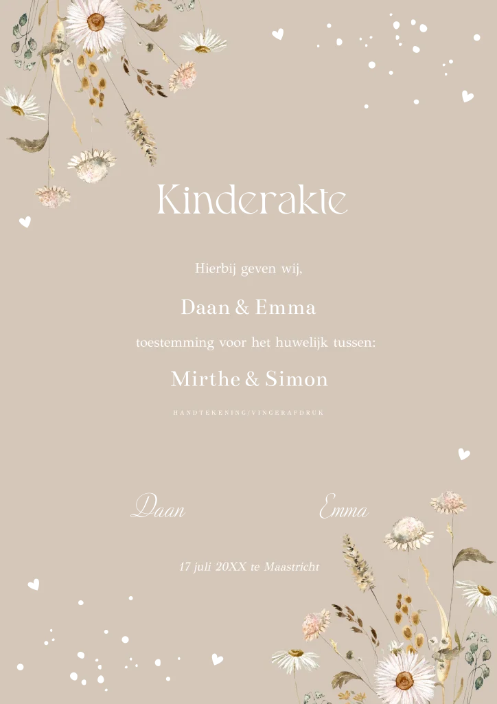 Kinderakte helemaal in stijl van jullie trouwkaart met beige veldbloemen en goudfolie.