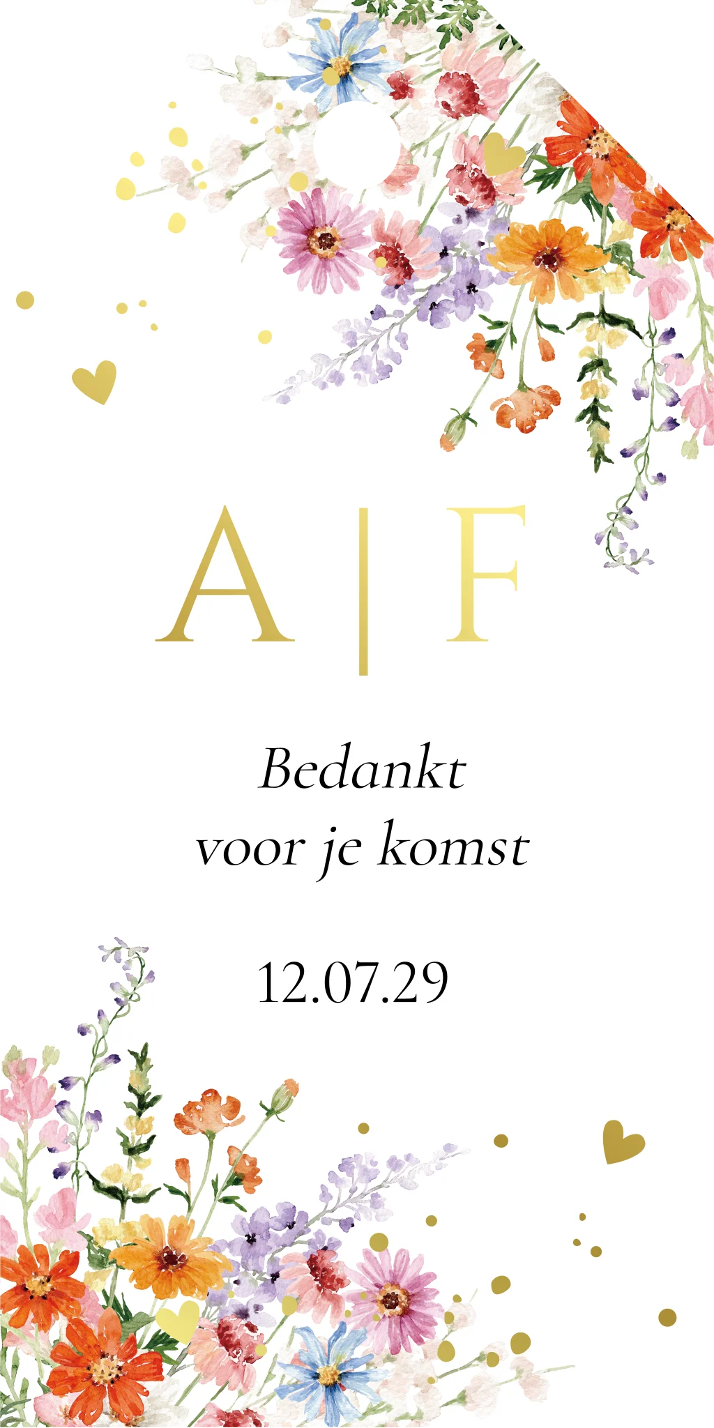 Een lief labeltje voor aan een doosje of ander klein cadeautje voor jullie gasten. Bewerk het kaartje helemaal naar jullie smaak, met jullie namen en de datum van jullie bruiloft of met een bedanktekstje. De labeltjes maken jullie huisstijl helemaal af en worden vaak bewaard als souvenir door jullie gasten.