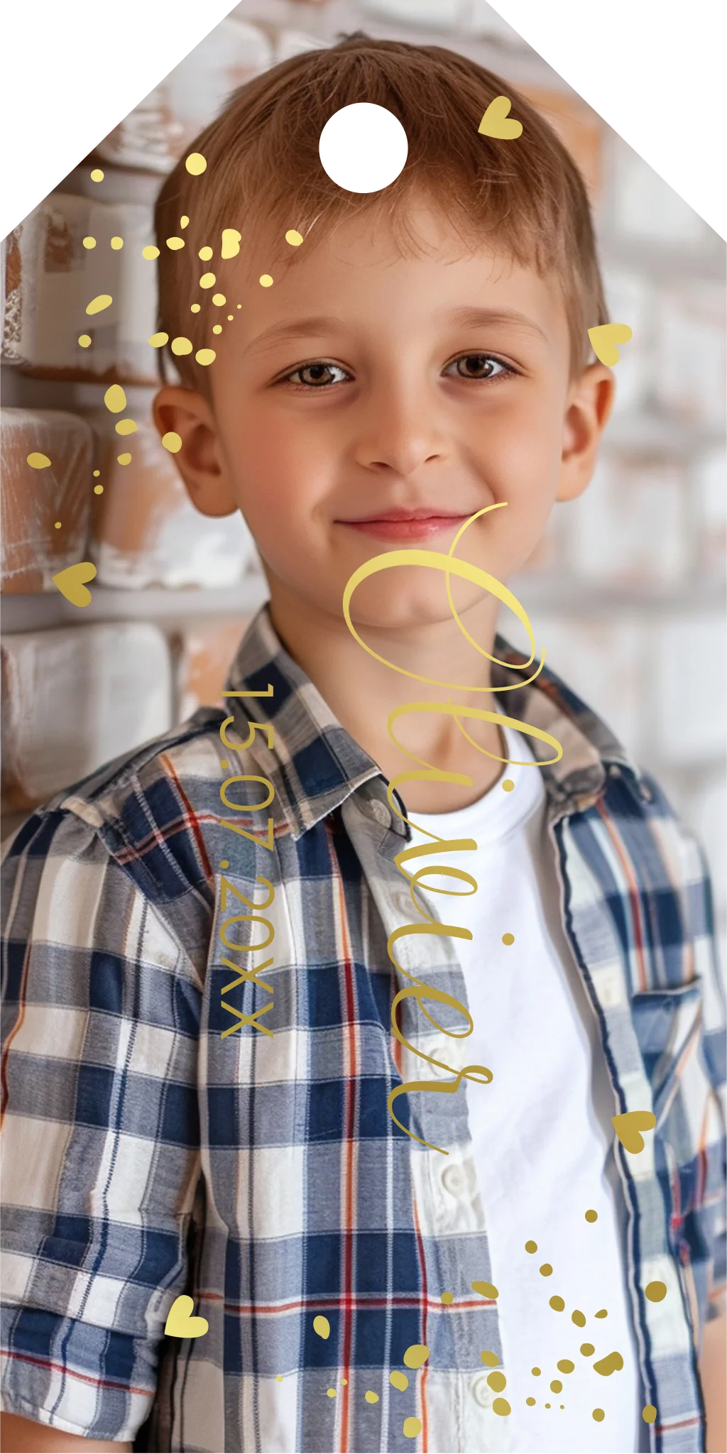 Op zoek naar een uniek en origineel communie labeltje met foto, naam en datum in goudfolie? Zoek niet verder! Dit lieflijke labeltje is perfect voor het decoreren van een doosje of ander klein cadeautje voor jullie gasten. Het kaartje kan volledig worden gepersonaliseerd naar jullie smaak, met de naam van jullie kind, de datum van de communie of zelfs met een speciaal bedanktekstje.