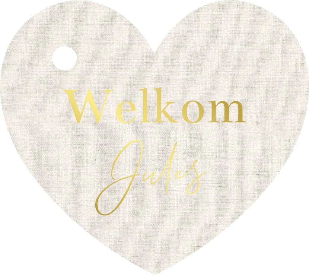 Bijpassende label hartje met boorgaatje in de stijl van het geboortekaartje. Bewerk de labeltjes in hartjes vorm gemakkelijk in de editor.