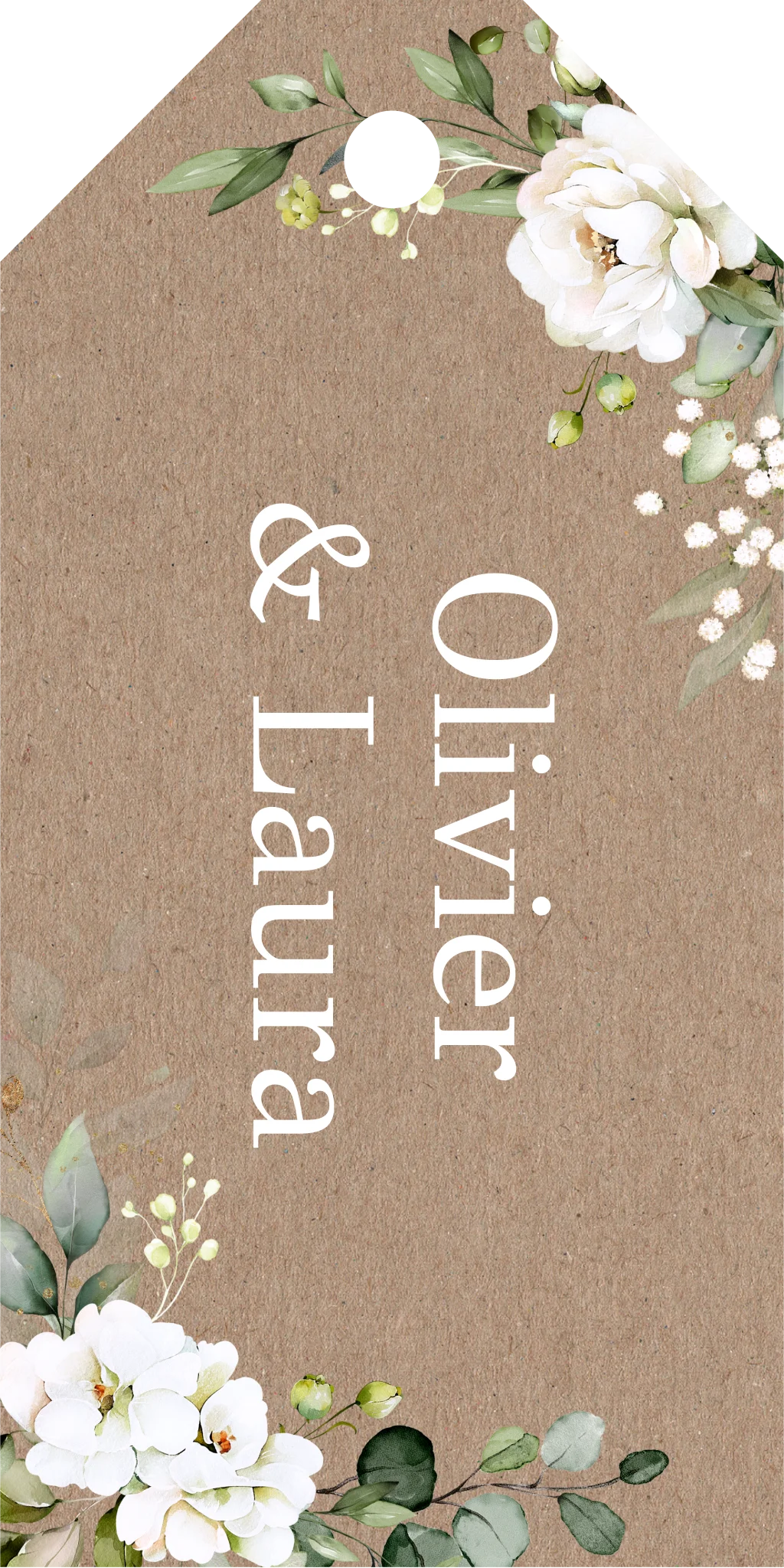 Labeltjes huwelijk kraftlook met witte bloemen en namen. Let op: omdat je kunt kiezen uit verschillende bevestigingsmaterialen bestel je het bevestigingsmateriaal van jouw voorkeur los bij de kaart. Specificaties van het labeltje: • 16 labels per vel. • Formaat: 3 x 6 cm. • Papiersoort: coated karton.