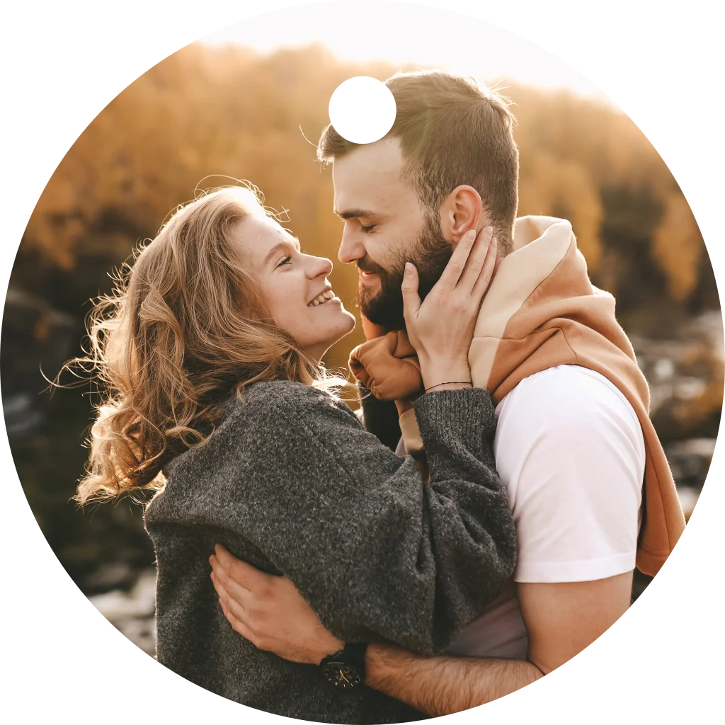 Ronde label met eigen foto en boorgaatje. Bevestig de label aan jullie trouwkaart met een lintje of touwtje .