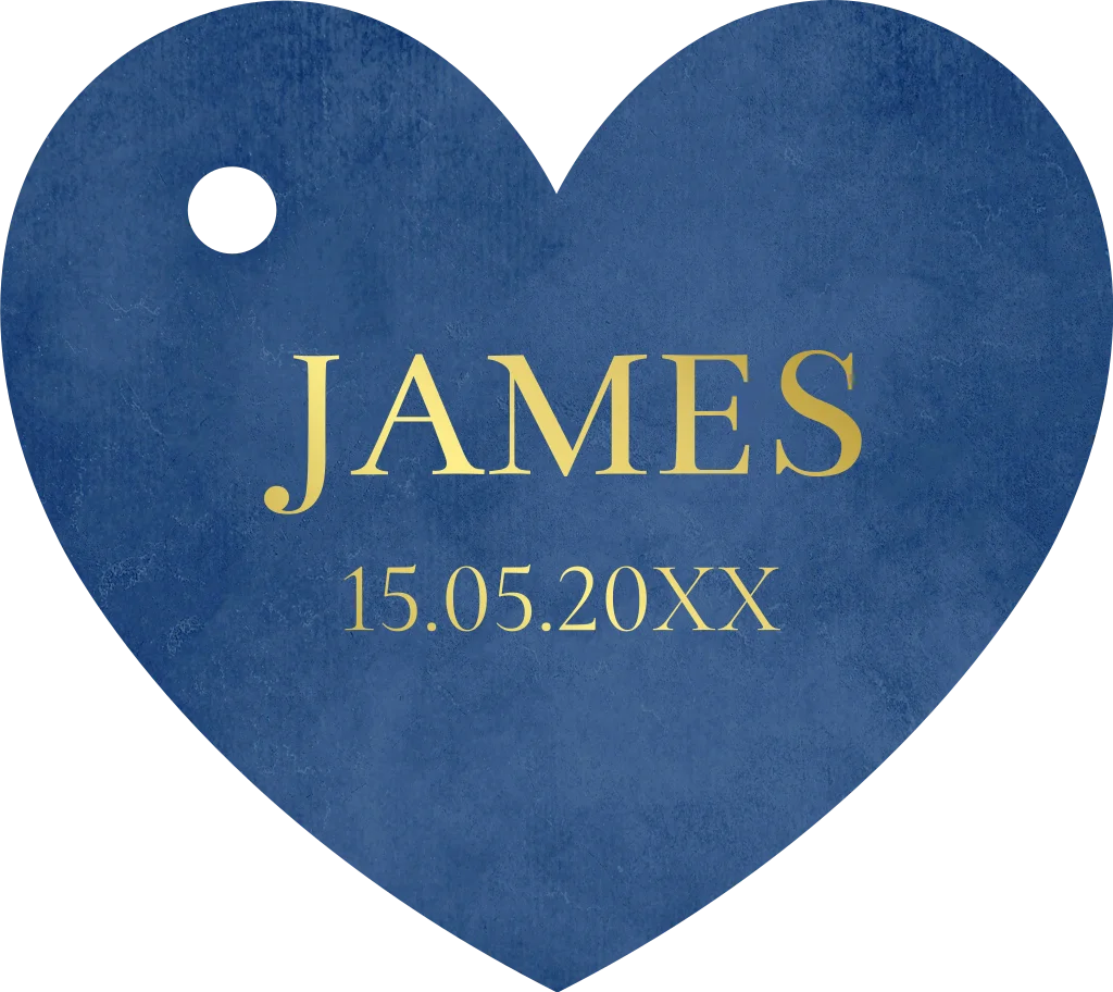 Labeltje communie hartje blauw roestbruin met naam en datum in goudfolie.