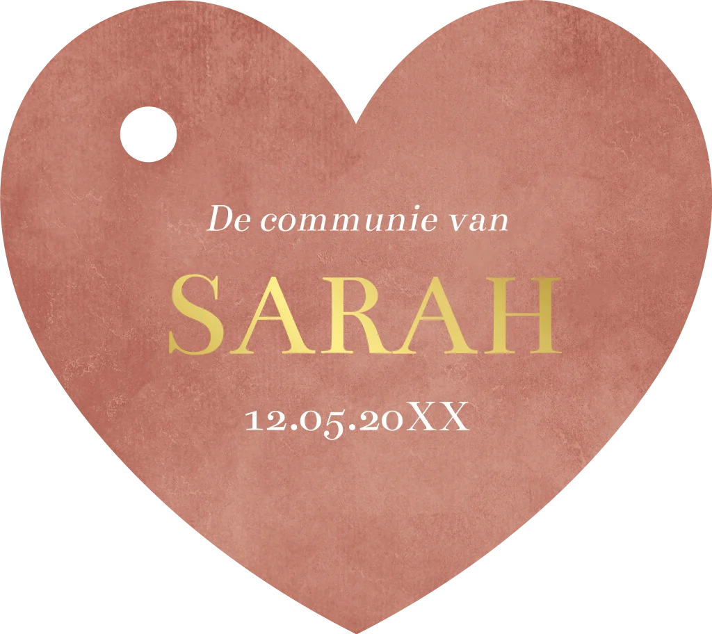 Onze exclusieve collectie labeltjes voor communie biedt dit prachtige terracotta labeltje in de vorm van een hartje, een uniek en luxe item dat perfect is voor speciale gelegenheden. Het roestbruine labeltje wordt gepersonaliseerd met de naam en datum naar keuze, aangebracht met prachtige goudfolie voor een elegante uitstraling.