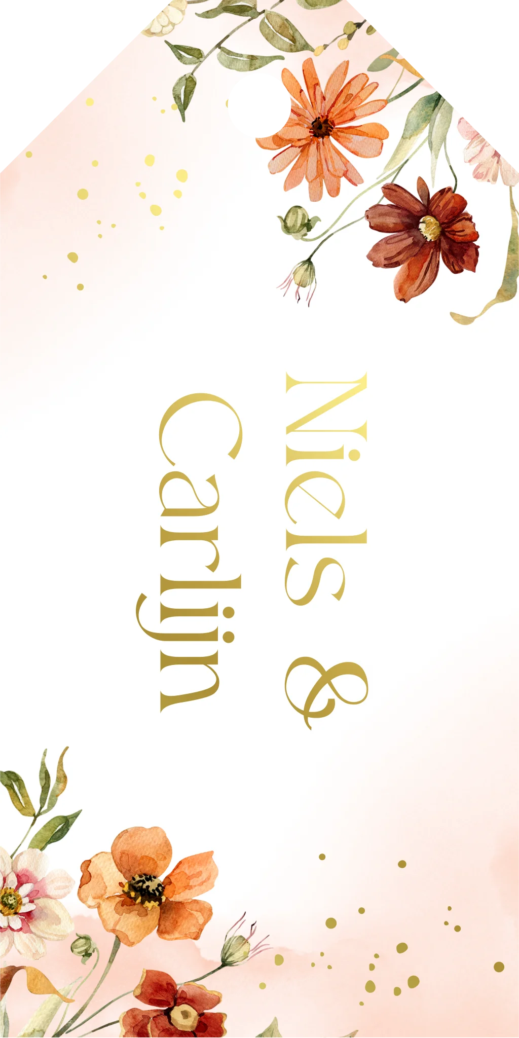 Labeltjes huwelijk met bloemen pasteloranje en goudfolie. Let op: omdat je kunt kiezen uit verschillende bevestigingsmaterialen bestel je het bevestigingsmateriaal van jouw voorkeur los bij de kaart. Specificaties van het labeltje: • 16 labels per vel. • Formaat: 3 x 6 cm. • Papiersoort: coated karton.