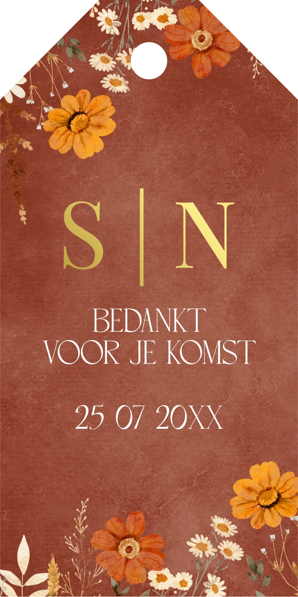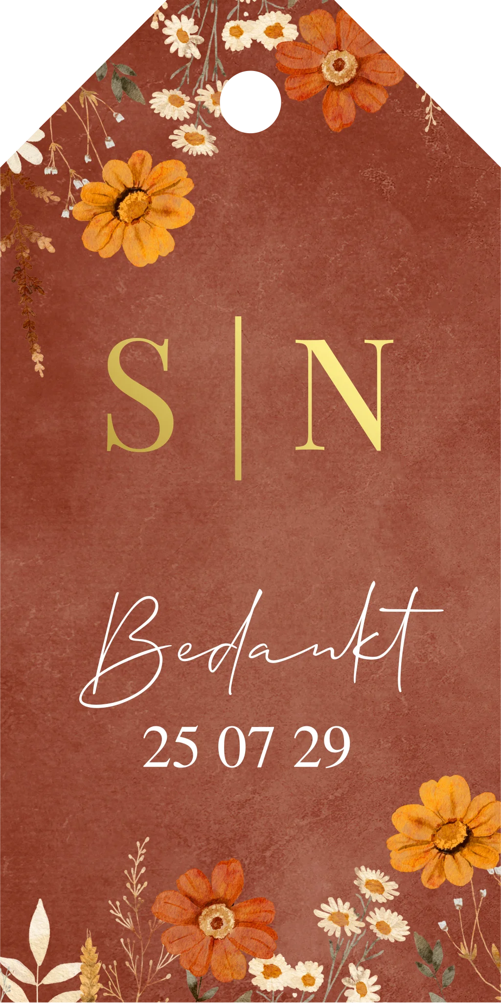 Labeltje met herfst bloemen en tekst bedankt in koperfolie. Let op: omdat je kunt kiezen uit verschillende bevestigingsmaterialen bestel je het bevestigingsmateriaal van jouw voorkeur los bij de kaart. Specificaties van het labeltje: • 16 labels per vel. • Formaat: 3 x 6 cm. • Papiersoort: coated karton.