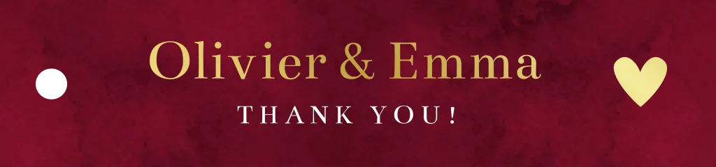 Labels huwelijk rood met namen in goudfolie. Bewerk de labeltjes in langwerpige vorm gemakkelijk in de editor.