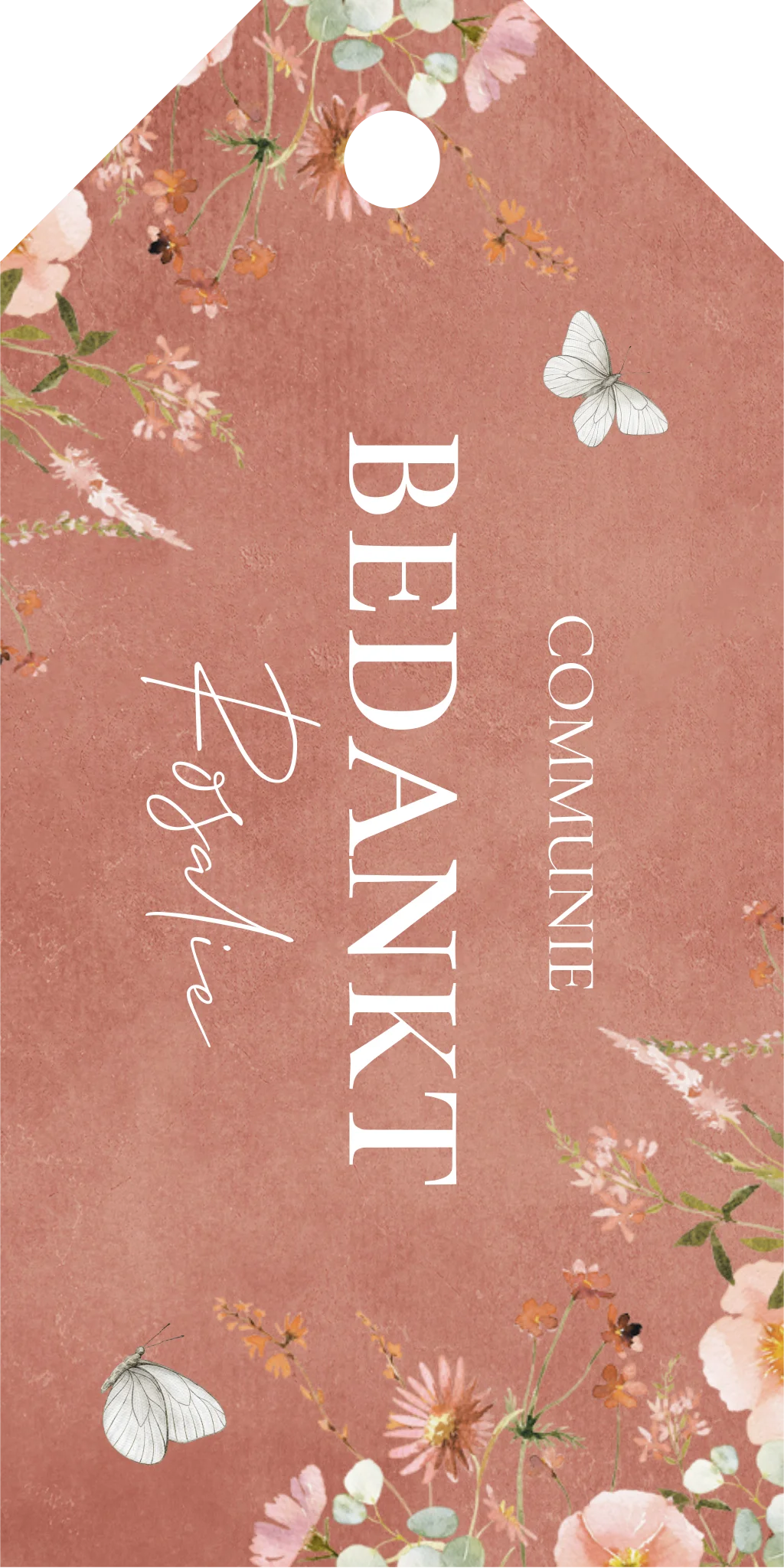 Labeltje met roze bloemen en tekst bedankt. Let op: omdat je kunt kiezen uit verschillende bevestigingsmaterialen bestel je het bevestigingsmateriaal van jouw voorkeur los bij de kaart. Specificaties van het labeltje: • 16 labels per vel. • Formaat: 3 x 6 cm. • Papiersoort: coated karton.