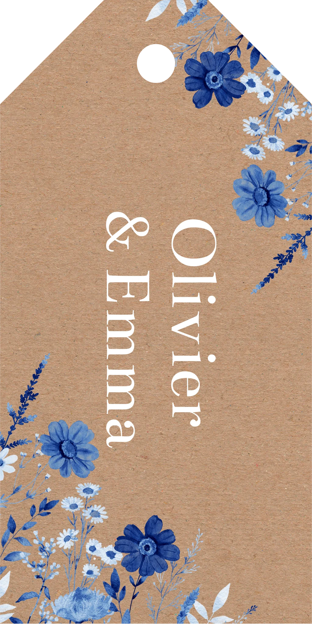 Labeltje met bloemen blauw en namen. Let op: omdat je kunt kiezen uit verschillende bevestigingsmaterialen bestel je het bevestigingsmateriaal van jouw voorkeur los bij de kaart. Specificaties van het labeltje: • 16 labels per vel. • Formaat: 3 x 6 cm. • Papiersoort: coated karton.
