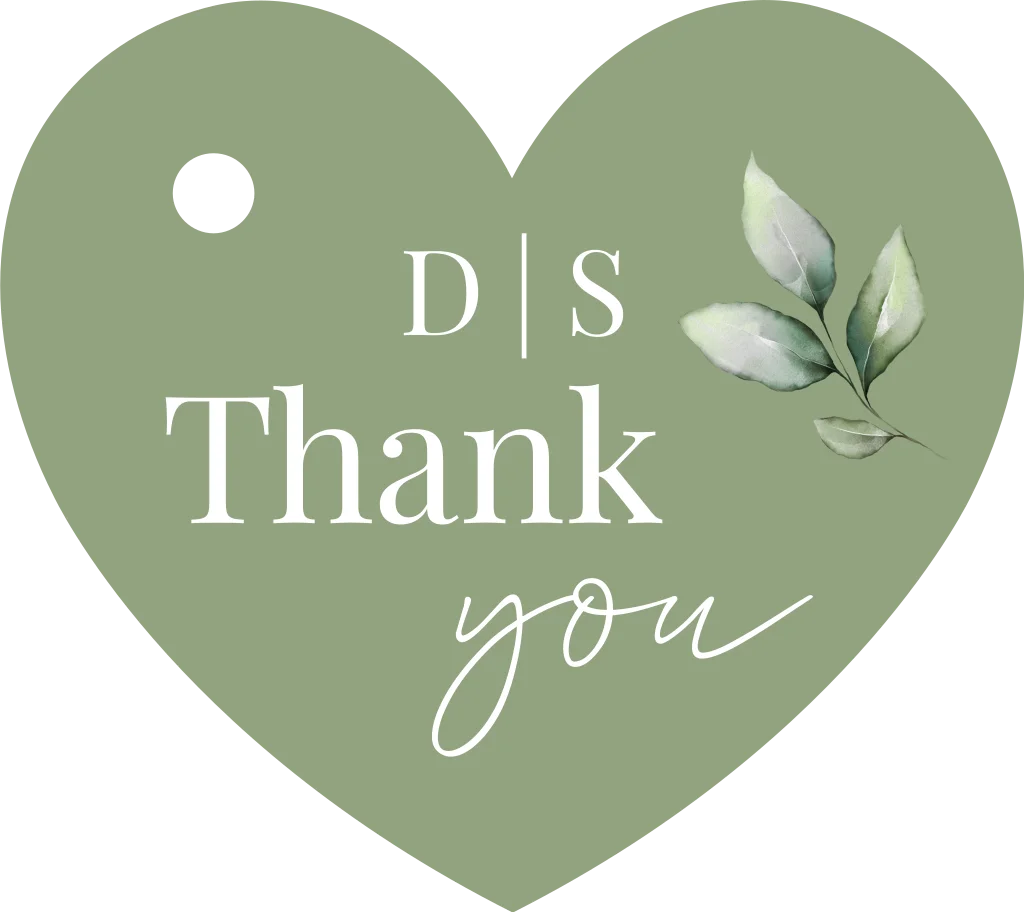Groene labeltjes huwelijkThank You in hartjes vorm met gaatje 46x40 mm | 16 stuks