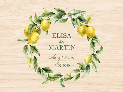 Een schitterende houten memorybox voor een bruiloft met krans van balderen en citroenen. Deze houten bewaardoos is stijlvol en vrolijk. Zet op deze bewaardoos jullie namen en bewaar in deze houten herinneringsdoos alle speciale herinneringen aan jullie bruiloft. - De kist is gemaakt van grenen hout en heeft ronde hoeken. - Aan de binnenzijde zit tussen het deksel en de kist een wit lint. - Aan beide zijkanten zit een handgreep. - Keuze uit twee formaten: 30 x 20 of 40 x 30 cm. - Foliedruk of hoogglans is niet mogelijk. LET OP: Hout is een natuur product en kan daarom afwijken van de schermkleuren en de trouwkaart. Dit is niet te voorkomen, elke kist is anders en heeft andere nerven en groeven. Op hout wordt de kleur wit niet gedrukt. De houten memory box bruiloft wordt apart verzonden van eventueel bestelde kaartjes, zoals de trouwkaart, bedankkaartjes of menukaarten. De levertijd van de box is 3 tot 4 werkdagen.