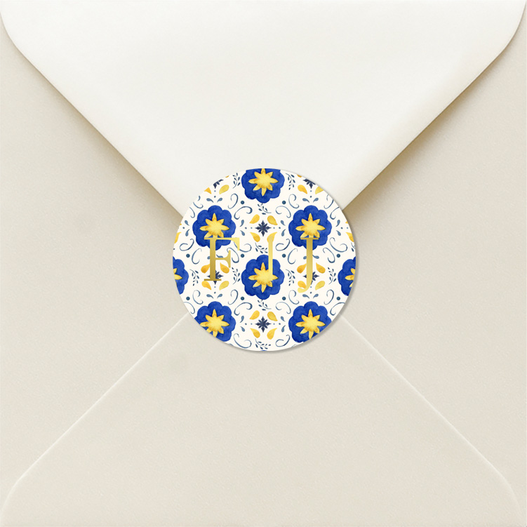 Mooie bijpassende sluitstickers mediterraans patroon blauw geel met goudfolie. Tip! Je kunt de sticker bewerken in onze editor. • Diameter 3,5 cm • Op één vel zitten 25 stickers Meer dan 1 vel nodig? Pas het aantal vellen aan in je winkelmandje.