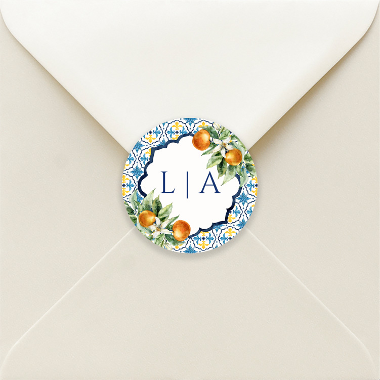 Sluitstickers huwelijk met Mediterraans sinaasappels en blauw patroon.