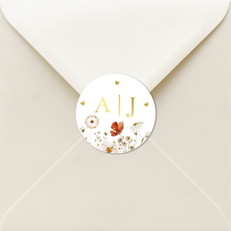 Mooie bijpassende sluitstickers trouwkaarten met bloemen. Tip! Je kunt de sticker bewerken in onze editor. • Diameter 3,5 cm • Op één vel zitten 25 stickers • Meer dan 1 vel nodig? Pas het aantal vellen aan in je winkelmandje.