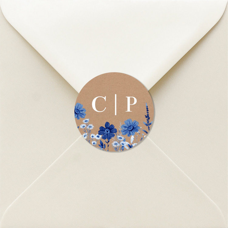 Sluitsticker kraftlook blue flowers goudfolie | 25 stuks