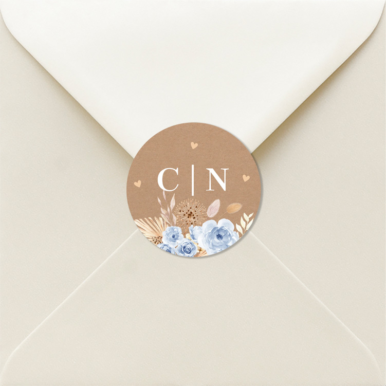 Mooie bijpassende sluitstickers huwelijk blauw rond met bloemen. Tip! Je kunt de sticker bewerken in onze editor. • Diameter 3,5 cm • Op één vel zitten 25 stickers • Meer dan 1 vel nodig? Pas het aantal vellen aan in je winkelmandje.
