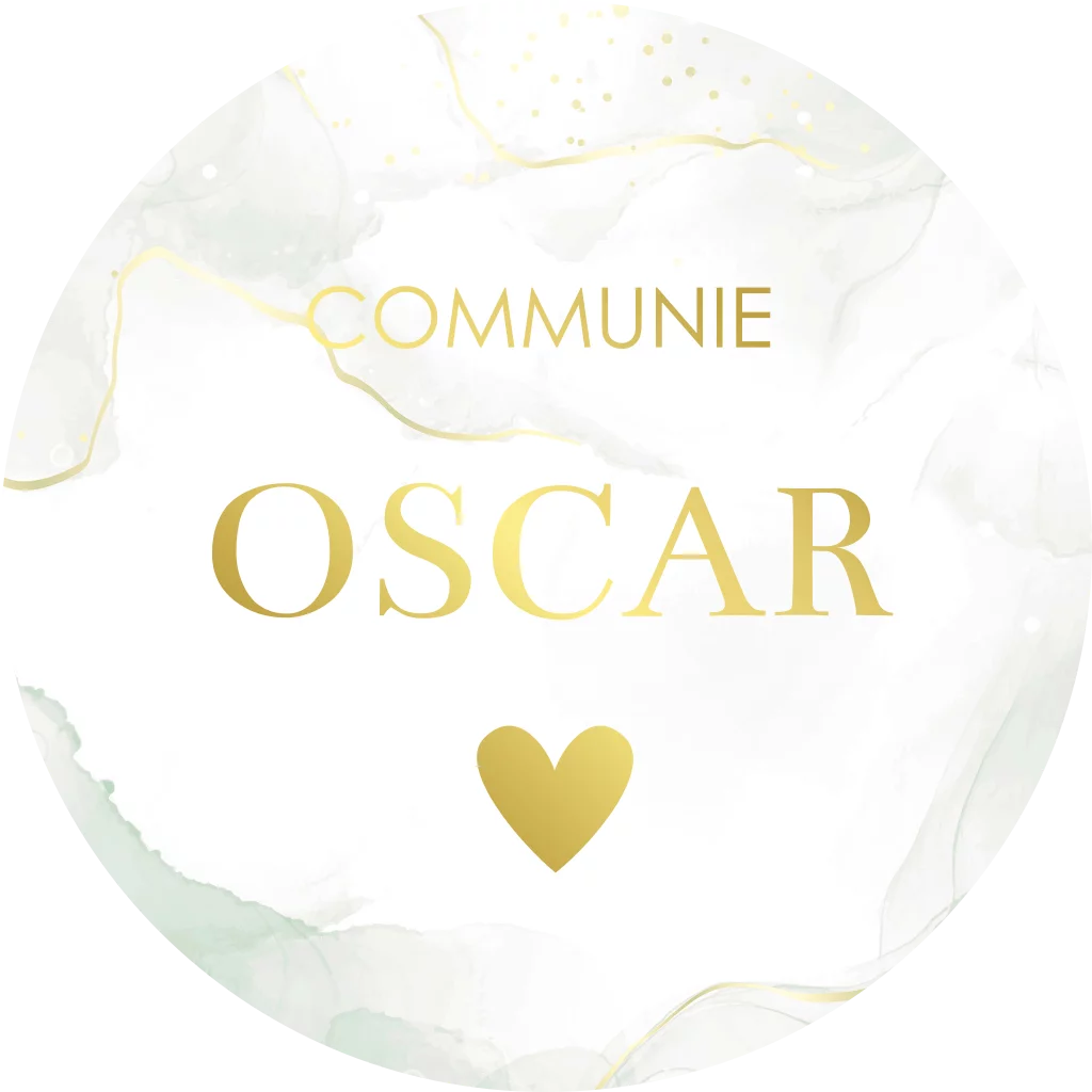 Stickers rond communie groen watercolour met naam en datum in goudfolie.
