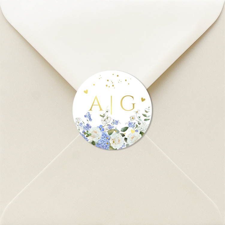 Stickers rond huwelijk bloemen blauw hortensia goudfolie