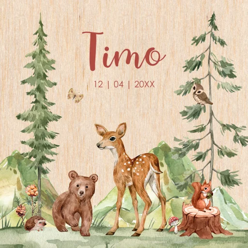 Geboortetegeltje met bosdieren in de natuur, hertje, beertje, bergen en bomen. Kies dit mooie tegeltje en personaliseer met eigen naam en datum.